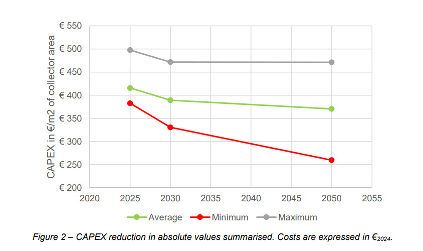 The starting point was a 7 MW solar district heating field of flat-plate collectors produced in Europe which cover 20 % of the heat demand in a heat network. For the reference year 2025, capital expenditures (CAPEX) and operating expenses (OPEX) over the entire project lifetime were estimated in a survey. Total life time costs ranged between 380 to 500 EUR/m2, with an average value of 416 EUR/m2. This value represents the full collector field costs (CAPEX and OPEX) excluding costs of storage, land lease and subsidies.